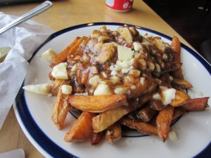 Now what is poutine? If you showed a picture of it to your doctor, he would reach inside his desk drawer, pull out a gun and hand it to you, saying, “if you want to kill yourself, you stupid m*therf*cker, you may as well do it right.” At least that’s what my doctor would say. It’s basically fries and squeaky cheese curds smothered in thick gravy. So very, very good when done right. So hideous when done wrong (hello, DQ, I’m talking to you.)