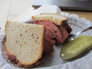 Deli … a subject as close to my heart as my probably clogged arteries. Being a New Yawker by birth, my deli crave is corned beef. Montreal smoked, all very nice. But REAL hot corned beef on rye … and I do NOT mean the pickly stuff you get here, even at pretty good delis … is a comfort food beyond compare. Kosher, of course. And don’t order the lean. It tastes better with a nice marbling of fat. Doctors, and Mark Bittman, cover your ears. In NY, the pickles go without saying. A side of good cole slaw is always provided. If you need another side (no one does, but who can resist), it’s the potato latkes with apple sauce. Sorry, don’t ask for cheese. Not kosher.