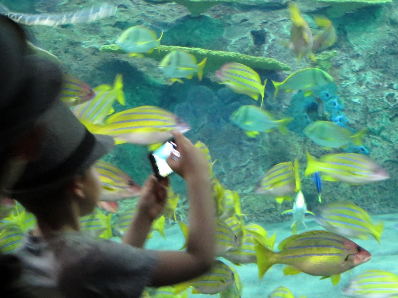 Then we’re deep underwater. It’s dark. There’s a moving sidewalk that doesn’t move. No need. Not a lot of people here. The youngest, with eyes wide and mouth open, gets to walk through a tunnel while shark glide by overhead and beside him. He stops, transfixed as entire tour groups try to move around him. The oldest explains to me why one shark can be still and not die. I’d heard that if I shark stops moving, it suffocates. Not so.