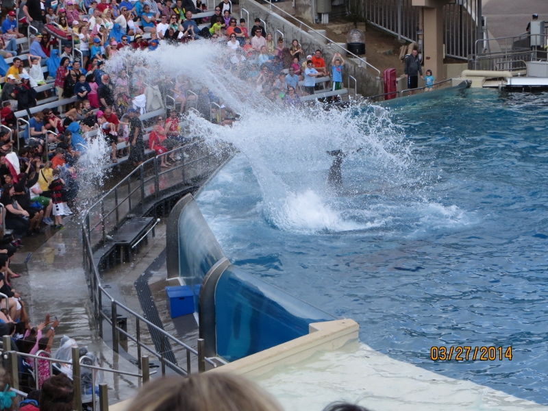Then the show started. The whales began by circling the tank, jumping in the air, then soaking everyone. I mean, SOAKING them. Like the teenagers at legoland had done. I feared they were out to soak me for pretending to be a serviceman.