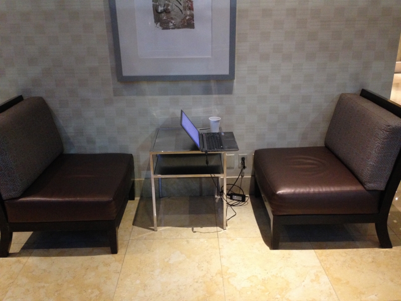 Downstairs in the lobby, I find a small table with a plug. I get a coffee. I sit down to write. My bum sinks deep into the chair. Too deep for me to use the table, so I put the laptop on my knees. It’s very warm. Sleepy warm.