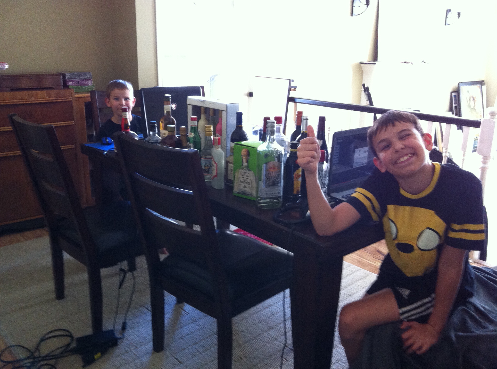 “No. I, ah, I have a lot of bottles because I DON’T drink a lot. Yeah. That’s it. I have lots of wine for when friends drop over and beer for other friends, and that bottle of Jack Daniels is for a friend, and that one over there is for another friend, and that huge bottle that your mom is hugging is called Tequila and is very expensive and used for special celebrations.”