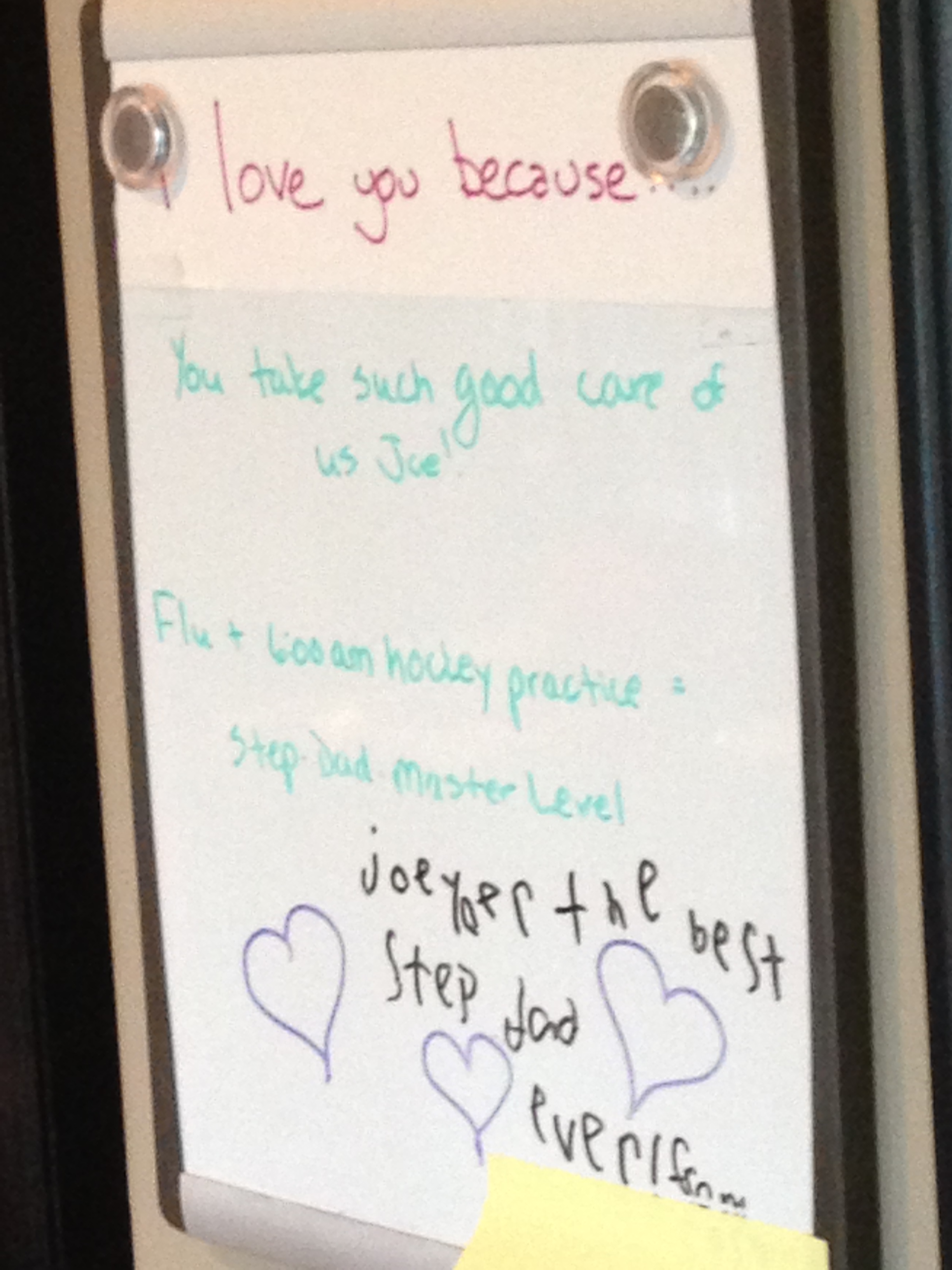 It was a simple thing. I was in my usual after-school mode of making sure lunch boxes got put by the dishwasher, that ice packs got put in the fridge, that homework was put on the table, when the Youngest went over to our family board and wrote something on it.