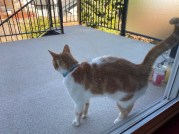 Found a cat at sliding door to the deck. He wanted in. We couldn’t let him in. Our dog would never forgive us.