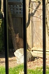 The Orange cat sat in the shade, trying to hide behind a tree, waiting to bully the smaller cat that came to our sliding