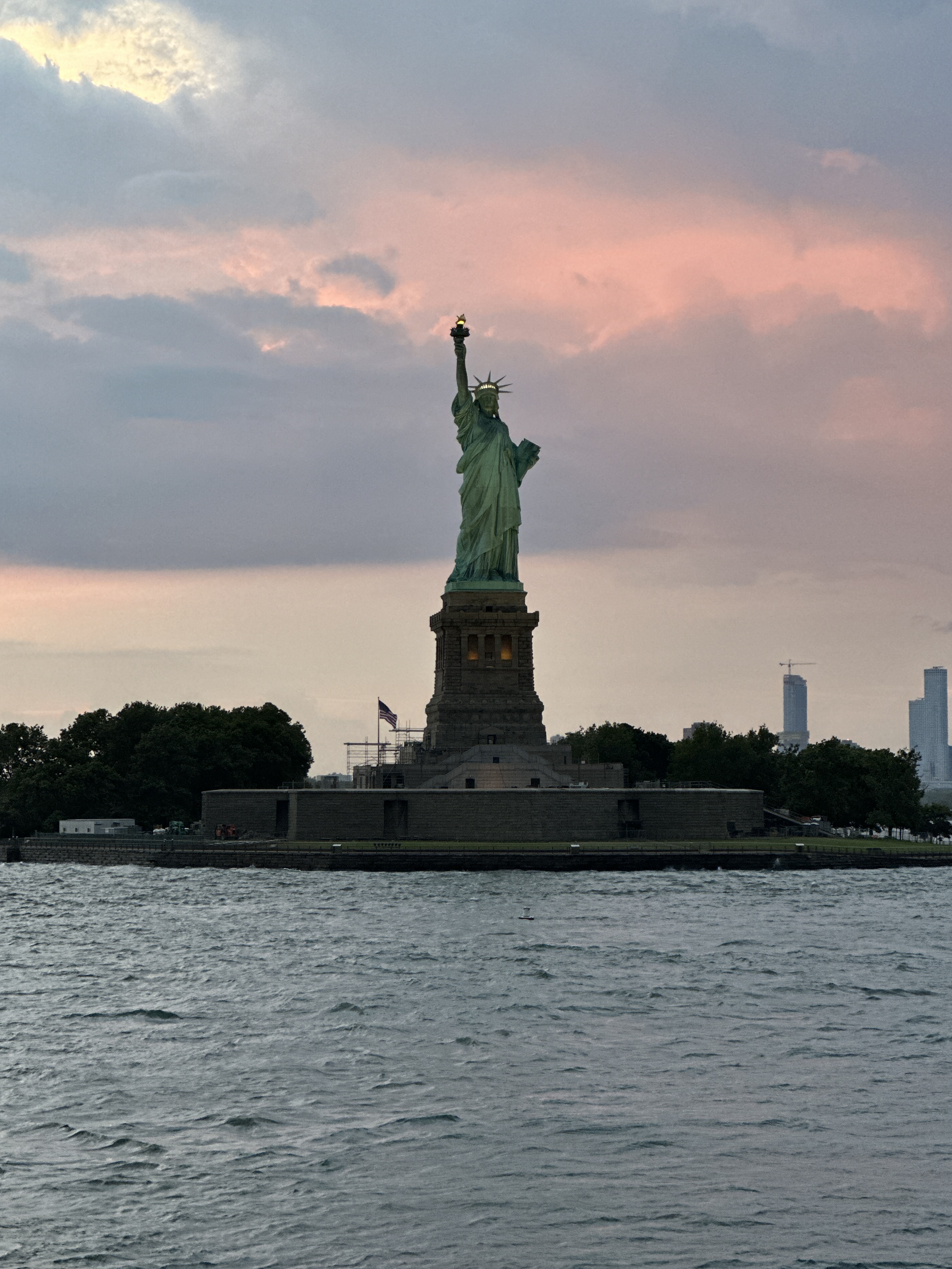 Then the sky lit up in bright pinks and purples in a stunning display of nature’s beauty. With the beautiful colours overhead, we sailed around the Statue of Liberty. It looked as though the great lady had set the heavens with rosy fire.